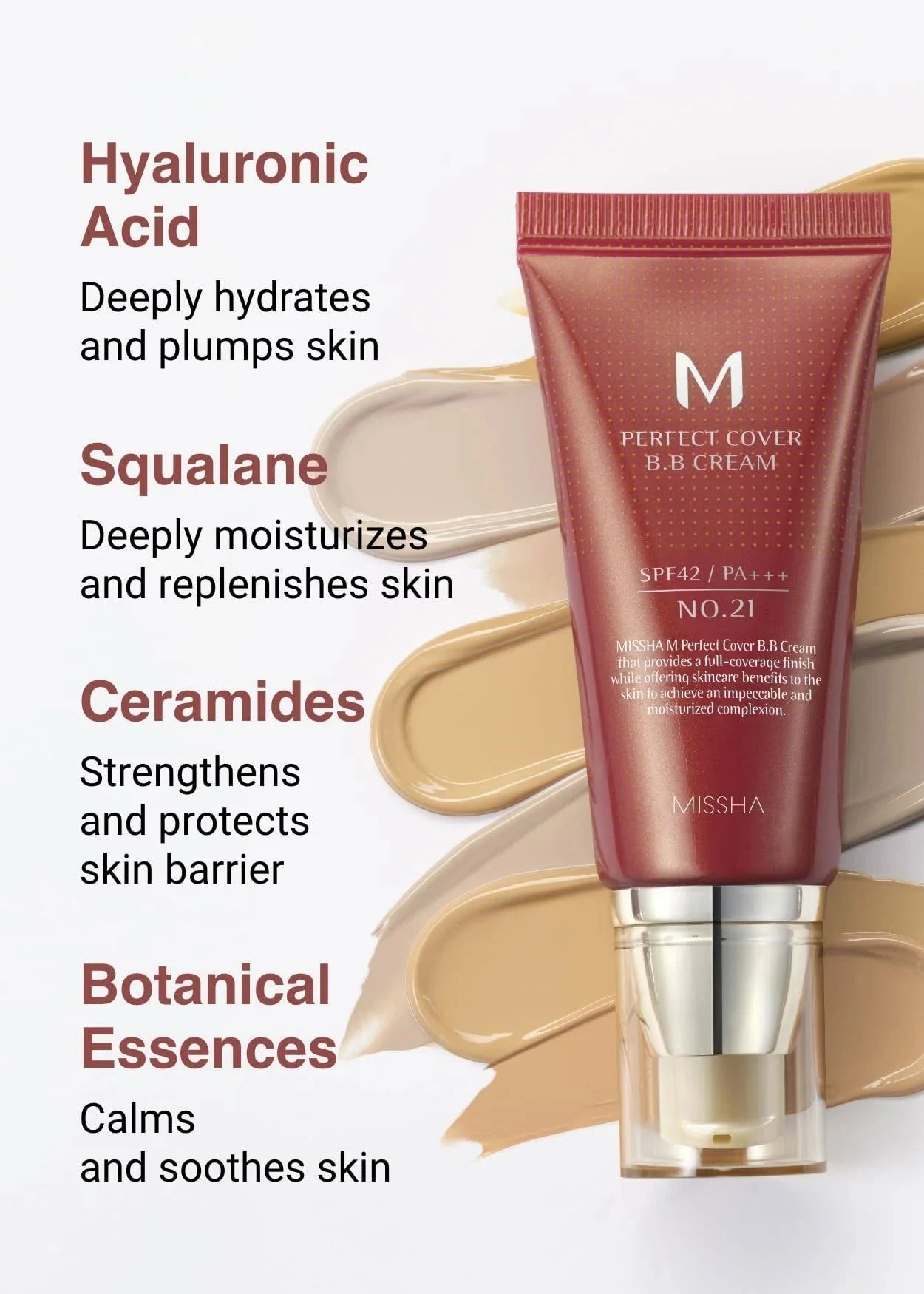 - Full Coverage & Smooth Finish: The MISSHA M Perfect Cover BB Cream #21 provides complete coverage, effectively concealing imperfections such as blemishes, dark spots, and acne scars, while offering a smooth and natural-looking finish.
